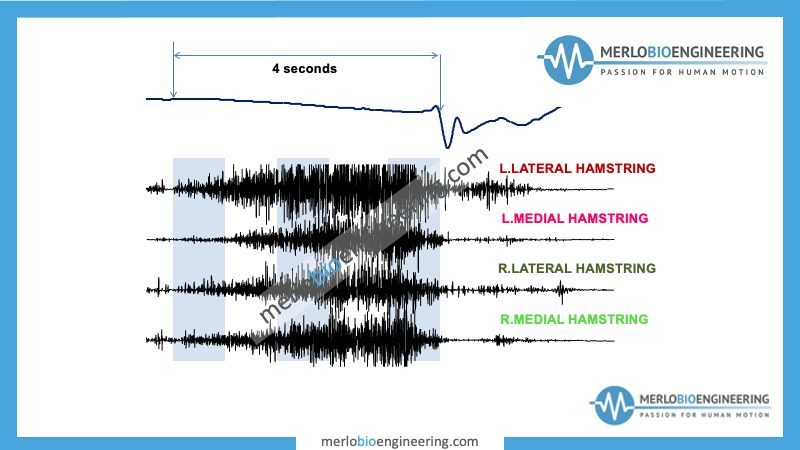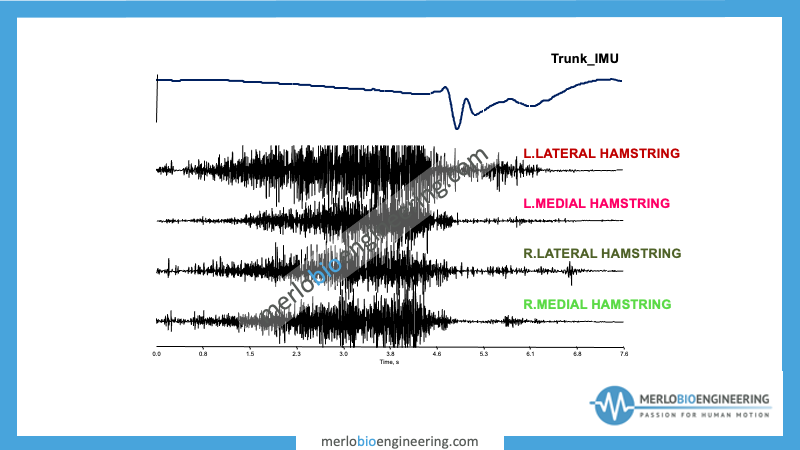 We applied EMG electrodes on the biceps femoris and semitendinosus of both lower limbs, together with an inertial motion unit (IMU) on the trunk of a professional footballer. This one performed the Nordic Test, where the subject has to counteract the falling force of their body through an eccentric contraction of the hamstrings, while the data was recorded by the equipment and then divided into three different phases.
