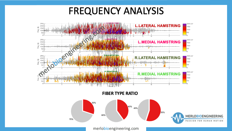 Finally, we were able to analyse which fibres are most activated: there is a greater percentage of white fibres at the beginning of the movement, while red-slow fibres activate most towards the end of the test, when the eccentric hold has to counteract a greater extensor moment at the knee by the force of gravity.