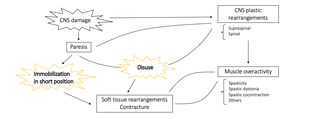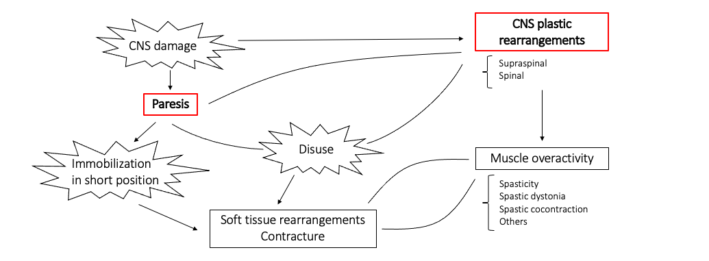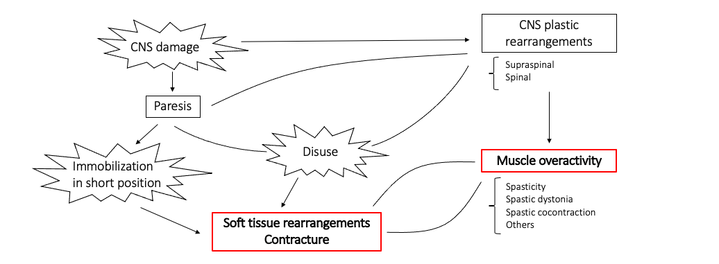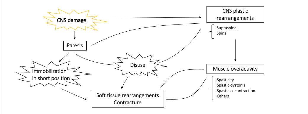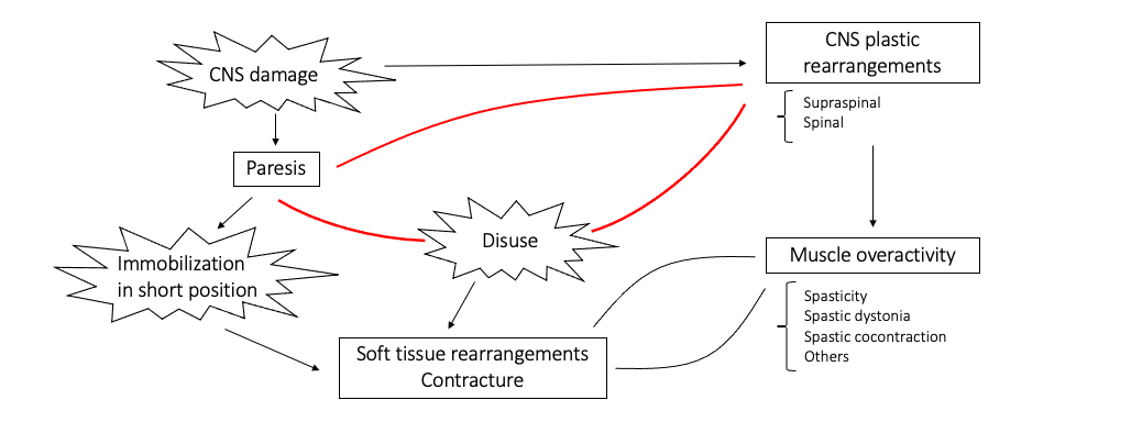 In patients with upper motor neuron lesions, the onset of muscle overactivity is quite common. This follows the vicious cycle described, among others, by Prof JM Gracies